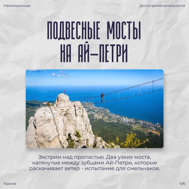 Подвесные мосты стали символом Ай-Петри и любимым местом для фотосессий. Но это не только аттракцион: переходя по ним, путешественник словно ощущает полное единение с природой и преодолевает собственный страх.