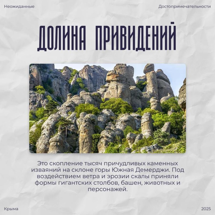 Крым для многих ассоциируется с пляжами, ялтинской набережной и Ласточкиным гнездом. Но у этого полуострова есть и другая сторона – менее очевидная, но не менее впечатляющая. Это места, которые не всегда попадают в туристические путеводители, но именно они позволяют почувствовать Крым. Мы собрали топ-6 неожиданных достопримечательностей, которые подарят новые впечатления: от мистической Долины привидений до бокала легендарного крымского коньяка из Коктебеля.